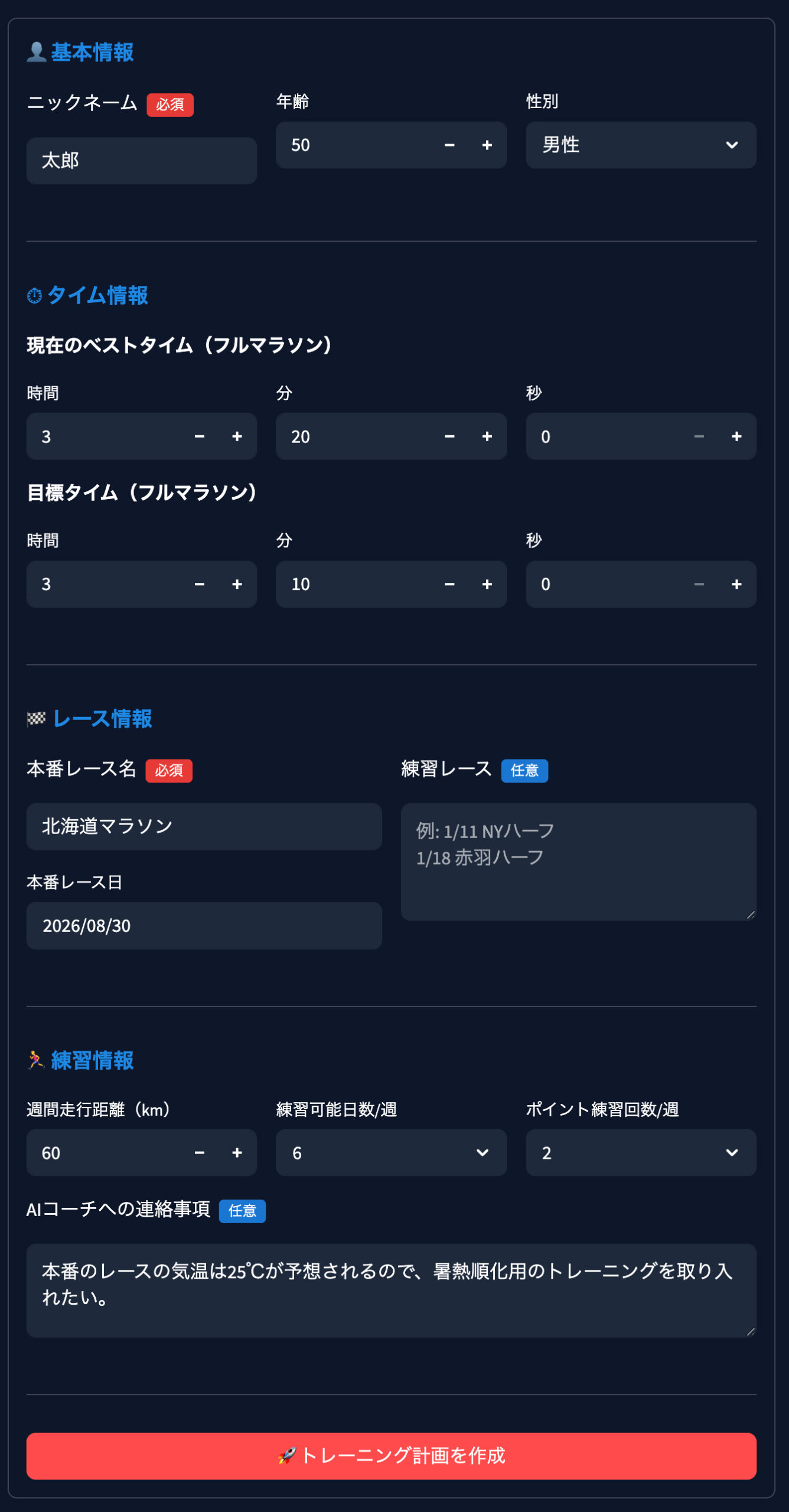 太郎さん、18週間という期間は、自分を信じて積み上げるのに十分な時間です。週80kmという高い志を、科学的なペース設定と暑さ対策で支えます。3:10:00という目標は、この計画を完遂した先にある必然の結果です。北海道の地で最高の笑顔でゴールしましょう!