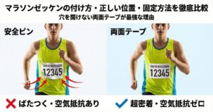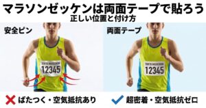 ゼッケンの両面テープ貼りの方法は、以下の記事で詳しく解説しています。