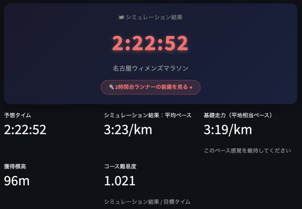 - コース: 名古屋ウィメンズマラソン(フラット、高低差16m)