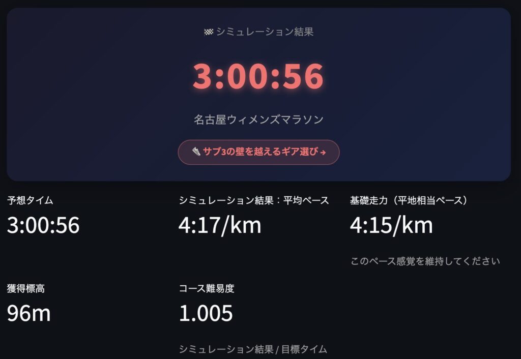 | サブ3 | 3:00:56 | 3:04:41 | +3:45 |