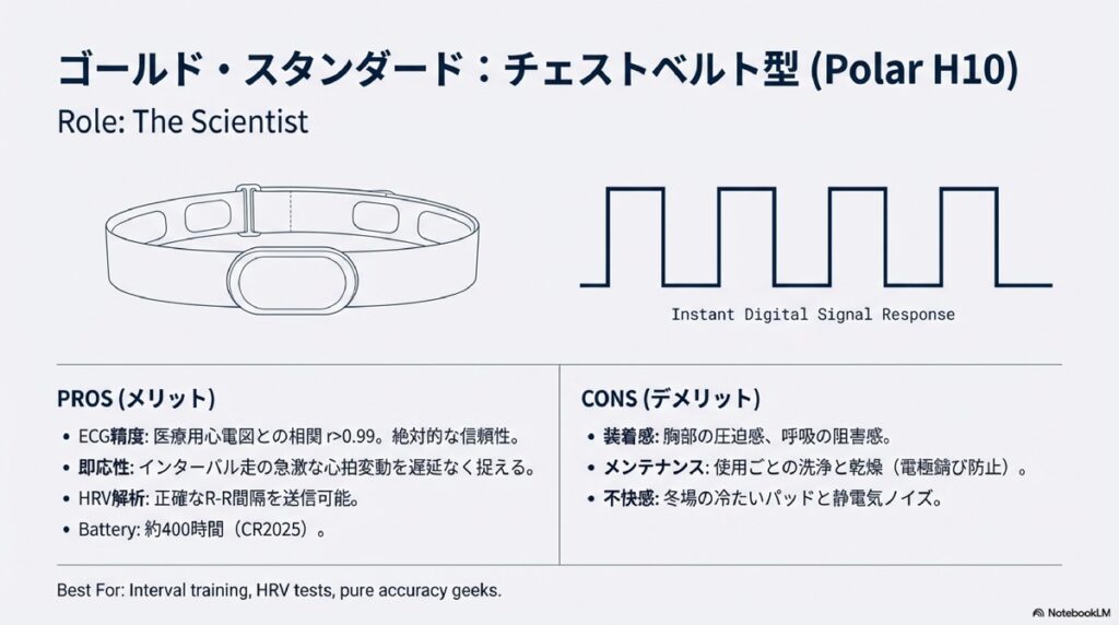 「じゃあチェストベルトを使えばいい」という声が聞こえてきそうです。確かにPolar H10などのチェストベルト型は、心筋の電気的興奮を直接検出するECG方式を採用しており、医療用心電図との相関はr>0.99と絶対的な信頼性を誇ります。