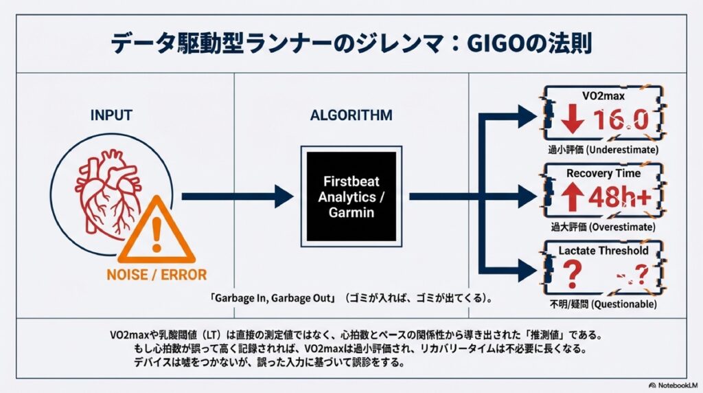 VO2maxや乳酸閾値(LT)は直接の測定値ではなく、心拍数とペースの関係性から導き出された「推測値」です。もし心拍数が誤って高く記録されれば、VO2maxは過小評価され、リカバリータイムは不必要に長くなります。デバイスは嘘をつきませんが、誤った入力に基づいて誤診をするのです。