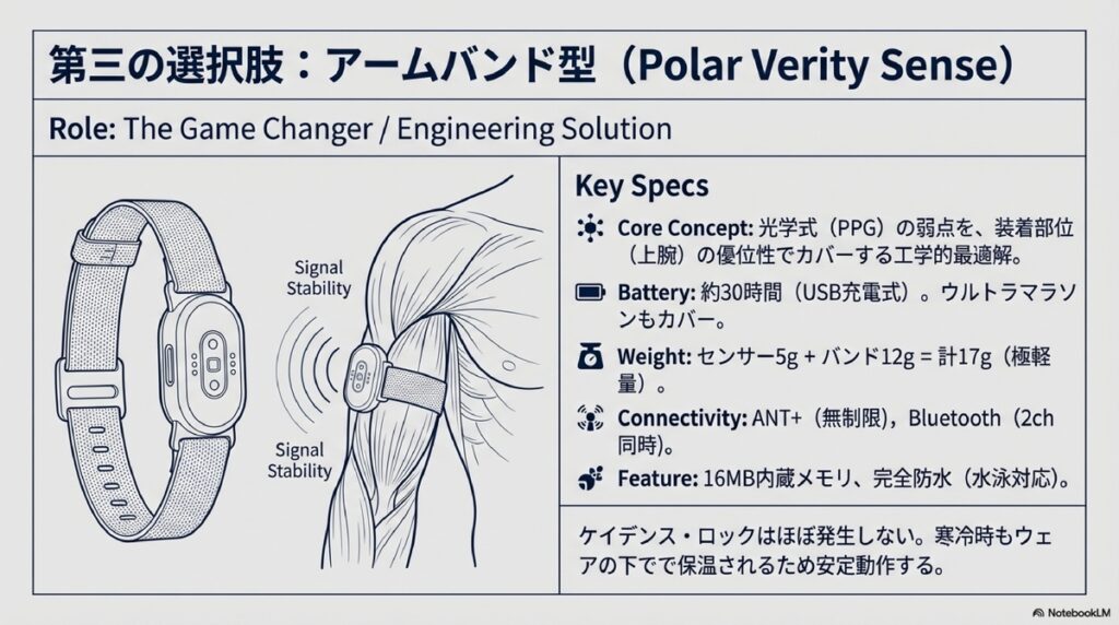 ここで登場するのが、Polar Verity Senseに代表されるアームバンド型心拍計です。同じPPG(光学式)でありながら、装着位置を「上腕」に変えることで、リスト型の弱点を克服しています。