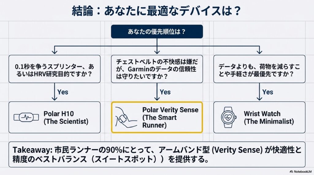 最後に、あなたに最適な心拍計を選ぶための指針をまとめます。市民ランナーの90%にとって、アームバンド型が快適性と精度のベストバランスを提供すると私は考えています。